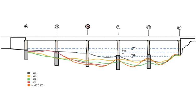 A erosão localizada é um dos principais fatores que contribuem para o colapso de pontes construídas em leitos aluvionares. Esse fenômeno ocorre quando a corrente do rio remove os sedimentos ao redor das fundações, enfraquecendo os pilares e provocando um rebaixamento da fundação da ponte (Rocha et al., 2008) . No caso da Ponte Hintze Ribeiro, esse processo foi acentuado pela erosão progressiva do leito aluvionar, que com o tempo causou exposição dos blocos da fundação dos pilares centrais. Isso reduziu a capacidade de suporte da estrutura e, no dia 4 de março de 2001, após um período de intensas chuvas e aumento da vazão do rio, o pilar P4 sofreu erosão excessiva ao seu redor, sendo assim, descalçado e desestabilizado. Investigações pós-colapso revelaram que o pilar P4 não possuía a proteção de enrocamento necessária, ao contrário dos pilares P2 e P3, que foram reforçados e, por isso, resistiram melhor às condições adversas (Rocha et al., 2008).